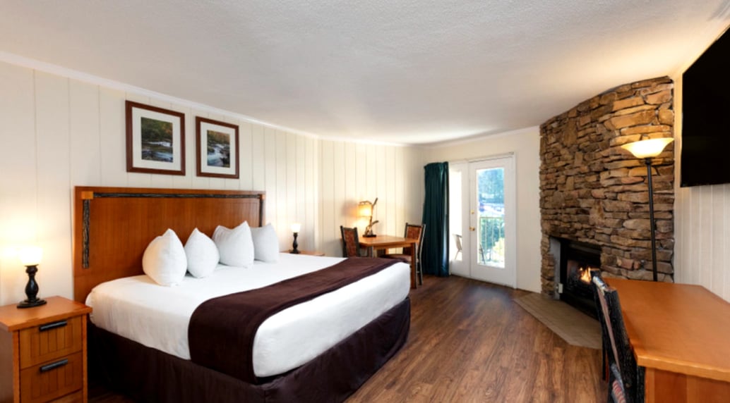 “The location was great and we walked to everything but the park. We had a River view room with a fireplace and a King size bed. The bed was comfortable and the pillows were huge. The water pressure was fine and the fireplace worked. We were two floors up and had a nice view. The room was clean and spacious.”